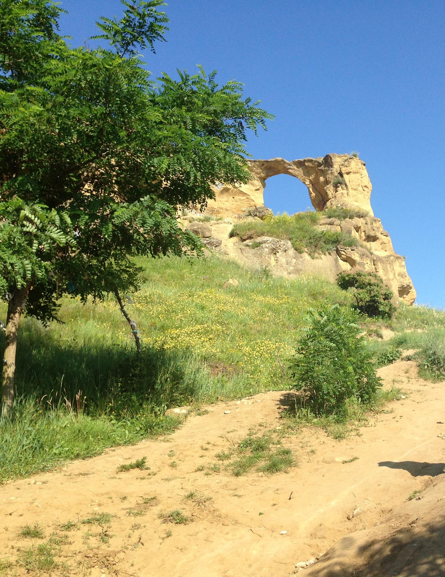 Ехать, как оказалось, не так и долго. Всего в трех километрах от развилки на Кисловодск свернули на асфальтированный съезд, а там уже открывается вид на эту 871-метровую природную достопримечательность. По сути это песчаник, который под действием ветров,солнца и эрозии, превратился вот в такую немного дырявую гору. Ну, как сказать, немного, почти 10 метров в диаметре, так что свободно можно проскользнуть и большой компанией из шести человек, коей мы и являлись.