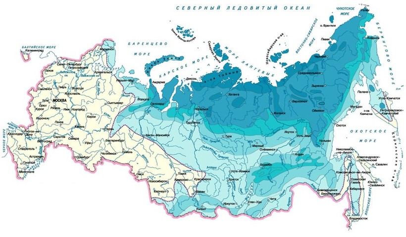 Многолетней мерзлотой занята четверть суши земли, а в России она занимает почти 60% или немного более площади территории. На огромной площади в 11 млн кв км температура не поднимается выше 0" С.