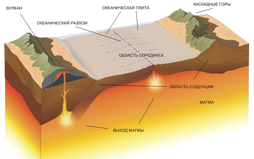 - области субдукции — места, где происходит погружение коры океанической под материковую.