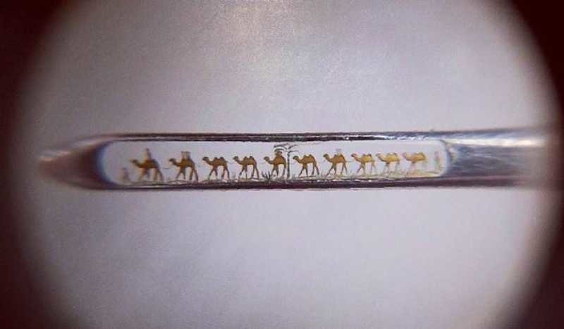 Еще меня восхитили целые композиции, которые автор миниатюр создал и поместил на другие небольшие предметы, чтобы люди, пришедшие посмотреть коллекцию, в полной мере смогли оценить мастерство. Представьте себе иголку, обычную, которую используют для ручного шиться. Так вот, в ушке этой иглы, в которую не каждый нитку-то с первого раза вдевает, помещен целый караван миниатюрных верблюдов. При этом каждый верблюд выполнен с максимальной точностью.
