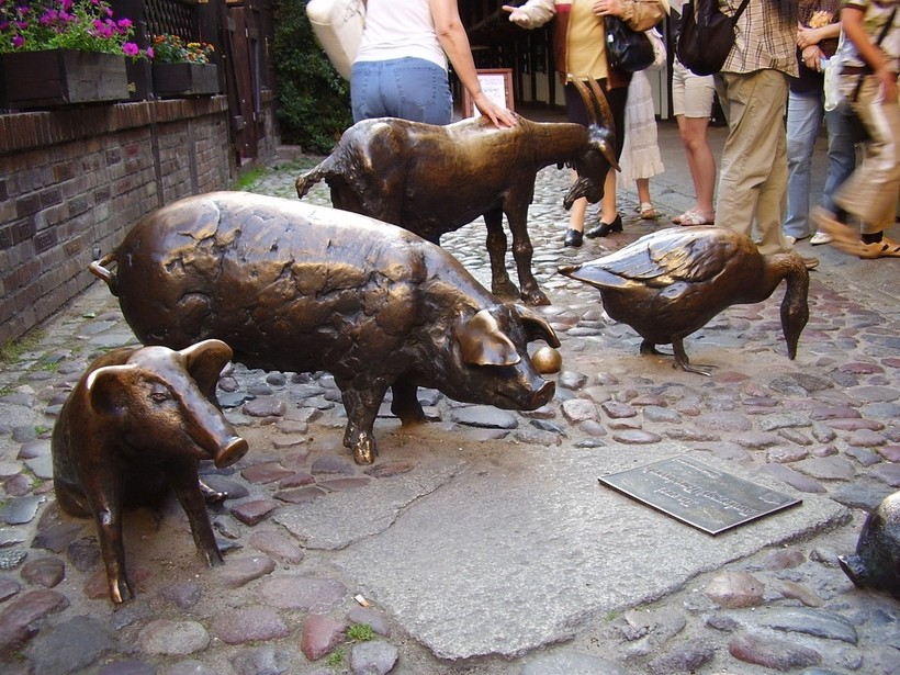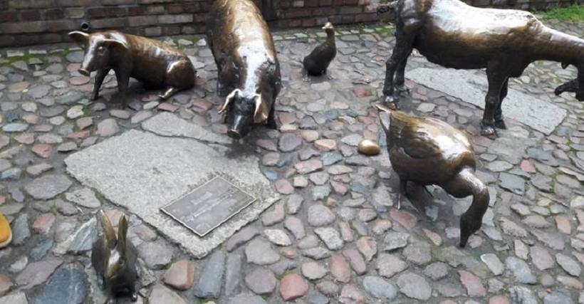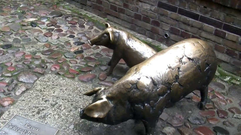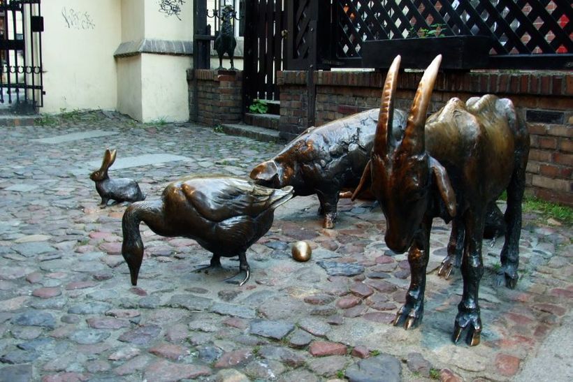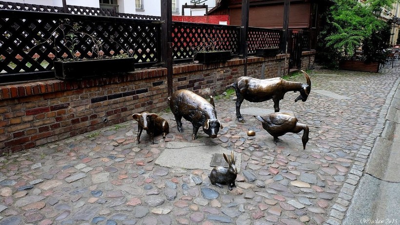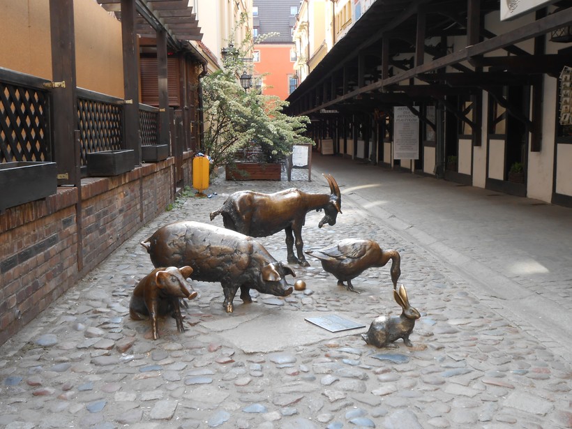 Совершенно случайно, гуляя по Вроцлаву, наткнулась на весьма интересное произведение искусства - скульптуры нескольких несчастных на вид животных. Я была удивлена - животные стоят свободно на тротуаре, никакого постамента, при этом не таблички, никакого мало-мальски понятного описания нет, поэтому пришлось экстренно выяснять, что это такое и по какому случаю возведена сия скульптурная группа из поросят, козы, петуха, гуля и крупного яйца, на первый взгляд гусиного.