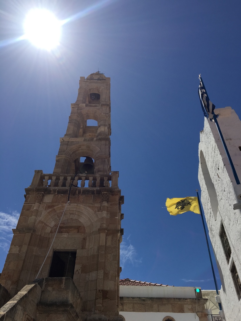 Церковь Богородицы в Линдосе находится в самом центре Старого города, поэтому пройти мимо нее практически невозможно. Когда мы первый раз приехали в Линдос из соседнего Лардоса, где проводили первую половину путешествия, то ноги почти сразу вывели нас к этой церкви. Еще до того, как мы поднялись на Акрополь и спустились в бухту Святого Павла, мы зашла в эту церковь. Точнее, увидели мы ее еще раньше – высокая, ажурная колокольня видна практически из любой точки города и с многих террас «домов капитанов», на которых сейчас работают кафе и рестораны.