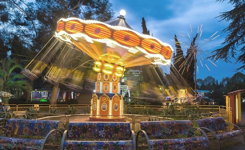 В Сочи темнеет рано, вечером парк окрашивается в разноцветные огоньки.Аттракционы со всех сторон радостно призывают тебя прокатиться. На любой ценник, но после Сочи-парка не захотелось.