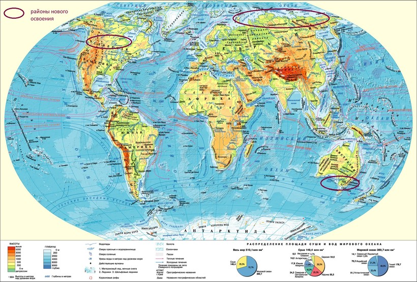 Из перечисленных районов, районами нового освоения можно назвать север Канады и России, запад Австралии. На севере Канады идёт добыча нефти и газа, а также обнаружены месторождения меди, ртути, золота и других металлов. Российский север также занимается нефтегазовыми разработками. Идет добыча леса, минеральных ресурсов. В западной части Австралии найдены большие месторождения золота.