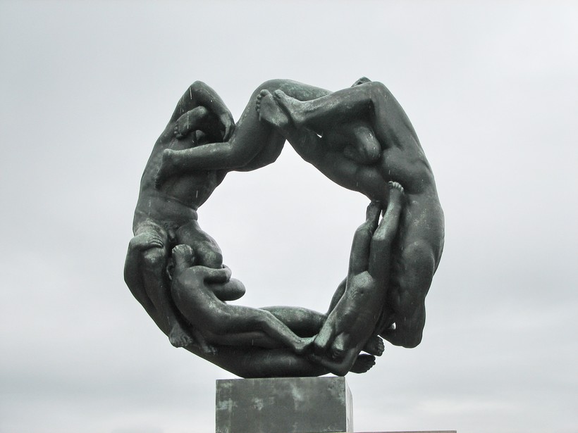 Как бы это сказать помягче, гулять по этому парку нужно, воспринимая все скульптуры, находящиеся здесь, как нечто развлекательное. Потому что как только начинаешь пытаться добраться до сути, она оказывается шокирующей, и такой до боли правдивой, что даже настроение портится. Вот колесо жизни. Вот вроде бы чего особого - замкнутый круг из человеческих тел. Но приглядевшись и рассмотрев его подробно, понимаешь, что здесь изображена цикличность жизни от рождения до смерти, и нет никакой силы, которая бы могла разорвать этот круг. Жестоко - нет, честно - да. Просто живя и радуясь, об этом особо не задумываешься, а стоит задуматься - и вот она, депрессия, здравствуйте, проходите.
