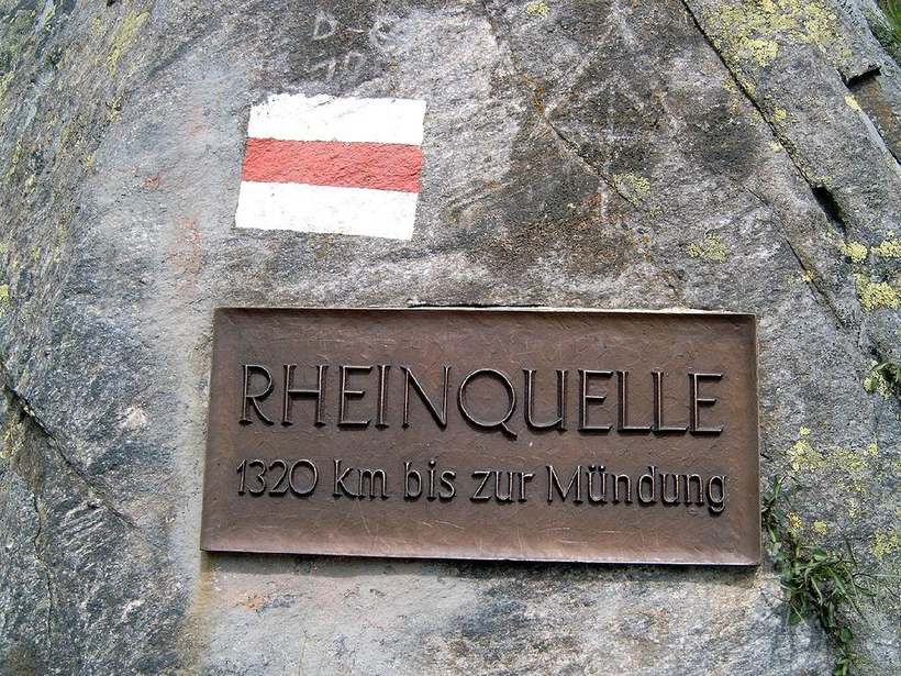 Исток этой могучей полноводной реки находится в Швейцарских Альпах, а именно, в месте встречи двух своих главных истоков, Вордер-Рейна и Хинтер-Рейна. Общая же система истоков Рейна чрезвычайно разветвлена, а притоков и вовсе не счесть. Бассейн Рейна тянется от перевала Флюэла в Восточных Альпах, находящегося практически на границе Швейцарии и Лихтенштейна, до главного швейцарского перевала Сен-Готард. В одноимённой горной области располагается озеро Тума, которое нередко именуют «началом реки Рейн».