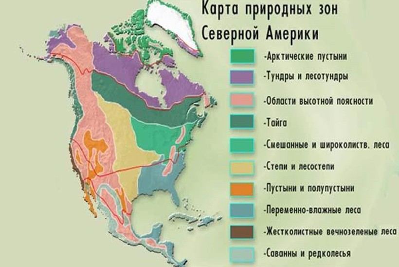 С востока на запад В Северной Америке сменяются природные зоны, пригодные для занятий сельским хозяйством. Эти зоны расположены в зоне умеренного климата. Для Северной Америки характерно наличие нескольких природных зон в умеренном поясе. Это связано с расположением горных систем, ограничивающих материк с запада, а также с характером изрезанности береговой линии, морских течений и ветров.
