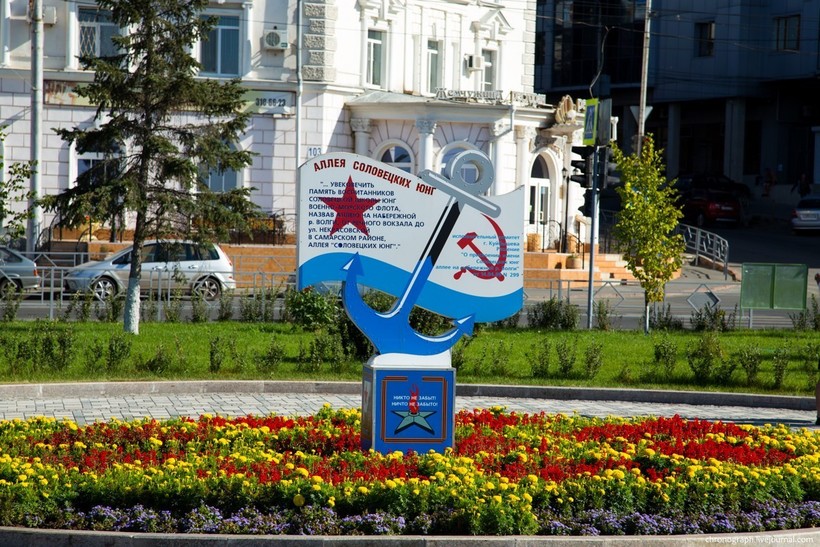 Набережная хоть и очень красивая, ухоженная, но однотипная, поэтому мы не заметили, как подошли к аллее соловецких юнг, её можно узнать по памятнику, посвящённому всем погибшим морякам во время Великой Отечественной Войны.