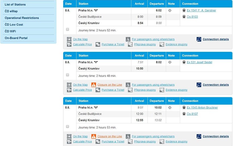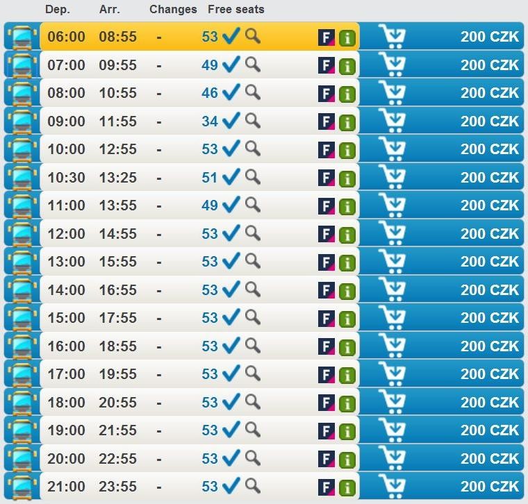 Традиционно указываете место отправления и прибытия, время поездки и машина выдает вам возможные варианты. Выбираете нужный рейс и оплачиваете билет. Пересадка будет на станции České Budějovice и обычно у вас есть 5-10 минут, чтобы сменить поезд.