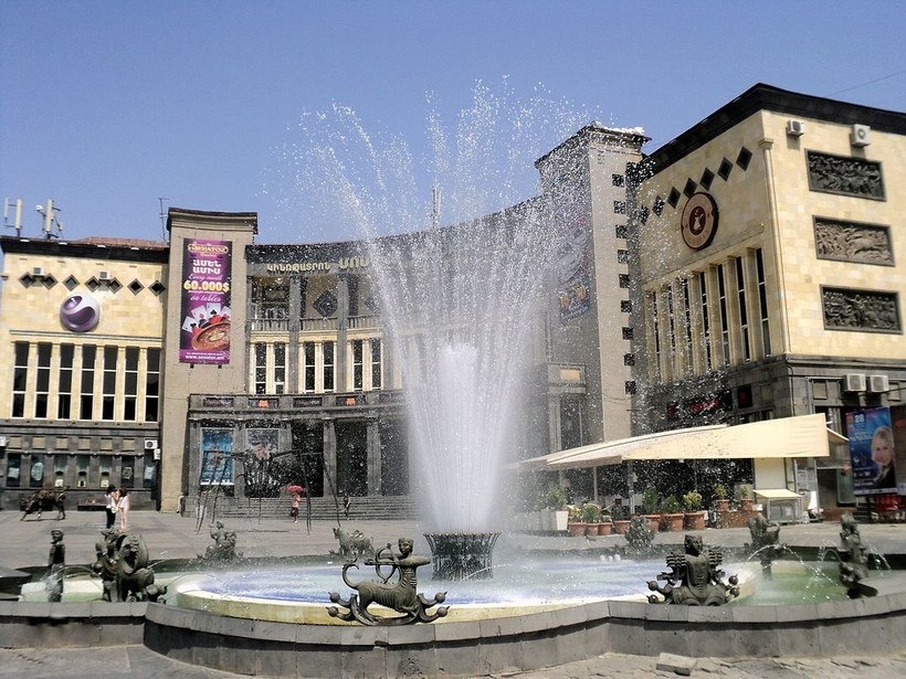 Площадь Шарля Азнавура смотрится очень в духе армянского благоустройства и архитектуры. Здесь очень уютно, и создается ощущение, что находились мы не где-то в Армении, а вполне на одной из площадей исторической части Москвы. Вокруг раскинулись здания, которые можно отнести к периоду привычной советской архитектуры. Например, с одной стороны по периметру Площадь огибает кинотеатр "Москва". Это мощное здание с массивными колоннами, выполненное в сдержанных цветах, привычных для сооружений советских времен.