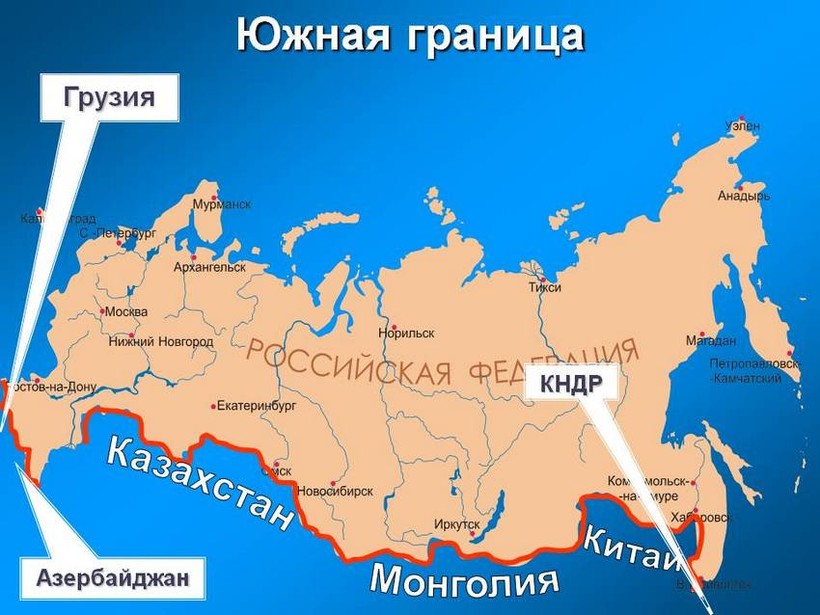 Таковой считается небольшая граница, а точнее ее участок, через который наша страна граничит с Республикой Азербайджан. Однако, к самым южным границам Росси можно отнести несколько участков, например: