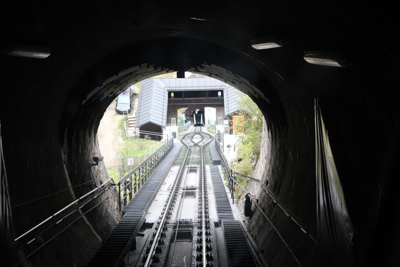 Второе – виды. Во время подъема/спуска открываются отличные виды на гору, на путь, по которому фуникулер идет, и на город. На линии работают две кабины, разъезжающиеся в центре пути.