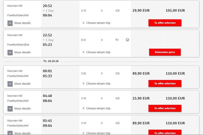 - Программа выдаст вам подходящие варианты. Как я уже говорила, выбирайте прямые рейсы (эту информацию можно узнать в 5 столбики, где написано Chg/пересадки. Там должна стоять циферка 0). Если нажать на оранжевую стрелочку, вы увидите детали поездки, в том числе информацию о платформах и времени поездки.