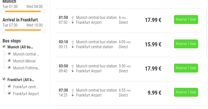Все автобусы отправляются с центрального автовокзала Мюнхена, который расположен вот тут: Прибытие же в основном происходит на остановку возле главного железнодорожного вокзала Франкфурта: Но иногда бывают рейсы, которые следуют в аэропорт Франкфурта (например, на скриншоте это рейсы с отправлением в 01:50, 03:50 и 07:30): Поэтому при покупке билета советую быть повнимательнее, дабы случайно не взять билет туда, куда не надо.