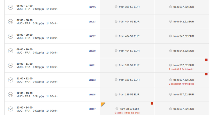 - В последних столбиках будут указаны две цены. Дешевые билеты действительны лишь на рейсах, указанных в билетах, в то время, как дорогие билеты распространяются на все рейсы. Кроме того, билеты по более высокой цене можно будет бесплатно сдать или обменять, а за проведение тех же операций с бюджетными билетами придется заплатить 17,5 евро.