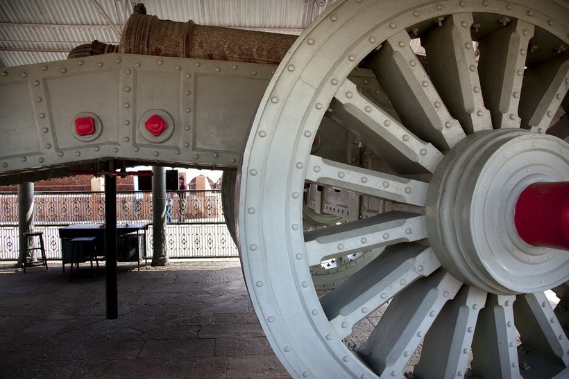 Пушка Джайвана считается самым большим военным орудием на колесах того времени. Хотя я читала, что она не самая большая, а самая тяжелая. Ее вес- 50 тонн. А самая большая по калибру- это Царь-пушка с калибром 890 мм, отлитая еще в 1586 году. Джайвана- такое имя пушка получила скорее всего в честь тогдашнего правителя Савай Джай Сингха 2-го, по приказу которого она была отлита в 1726 году. А вообще, форт считался центром по изготовлению артиллерийских снарядов и другого оружия.