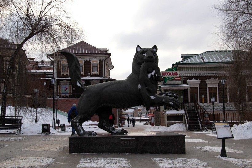Когда я изучала достопримечательности города Иркутска перед своей поездкой туда, мое внимание сразу же привлек символ города – некая скульптура бабра. На фотографиях был изображен интересный зверь, не то рысь, не то волк. Сложно было сказать – голова мне напоминала кого-то из семейства собачьих, а хвост лично мне показался абсолютно лисьим. При этом в зубах этот хищник держал какого-то маленького пойманного зверька – то ли норку, то ли куницу, насколько мои школьные познания могли это определить.