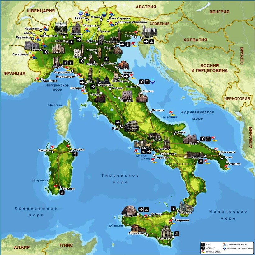 Италия — это южная страна Европы, которая расположена на Апеннинском полуострове. Главной особенностью ее положения является то, что страна омывается 5 морями: Адриатическим (восток), Ионическим (юг), Средиземным (юго-запад), Тирренским и Лигурийским (запад). В состав государства входят острова Сицилия, Сардиния и Эльба. Это большие острова, которые очень важны для Италии. В средине страны расположены 2-е независимых карликовых страны: Ватикан и Сан-Марино.