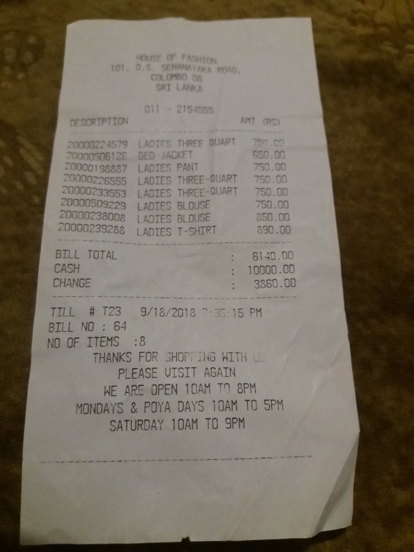 А говорят, что в Шри-Ланке нет шопинга. Я бы поспорила. Хочется рассказать о магазине в Коломбо, который удивил меня не на шутку. Это House of Fashions (Он же House of Fashion). У местных данный аутлет считается очень модным торговым центром, помимо этого его частенько посещают туристы. И всё потому, что здесь за сущие копейки продают брендовую одежду, которую отшивают в Шри-Ланке и Индии. Конечно, не всё так просто – у изделий отрезаны фирменные ярлыки, а значит, это отбракованные партии. Но, как правило, дефект незаметен, либо быстро устраним, либо совершенно не является дефектом в нашем понимании (карман прострочен нитками другого тона). Помимо известных мировых марок, в магазине продаются и изделия местных фабрик.