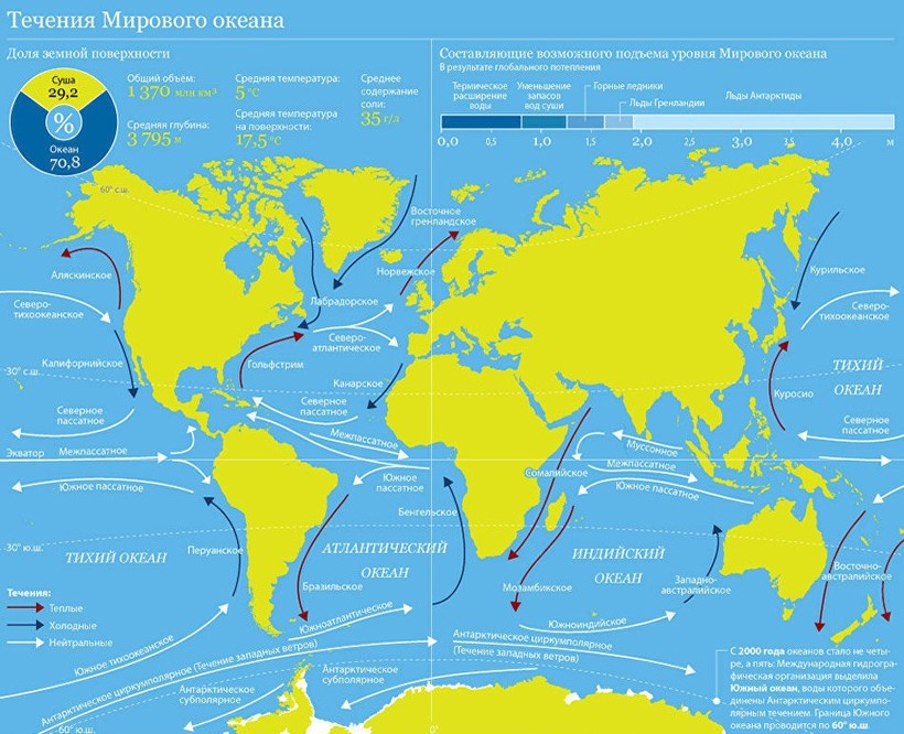 Итак, возникающие в морях (и океанах тоже) течения имеют колоссальное влияние на формирование климата нашей планеты. Пример перед нами: порт Мурманска за полярным кругом не замерзает потому, что его берега омываются теплым атлантическим Норвежским течением.