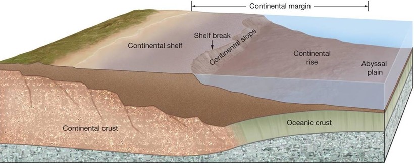 Морское или океанское дно кончается не там, где начинается суша. Оно находится в нескольких десятках километров от берега. Эти несколько десятков называются шельфом. Английское слово shelf переводится как «полка». Чтобы нарисовать в голове картинку, где шельф, а где морское дно, я представляю, что шельф – это полка, в конце которой обрыв – переход к материковому склону.