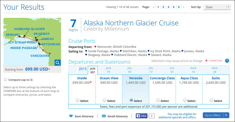 Сайт компании Celebrity Cruises встречает меня как раз баннером Аляски. Минимальная стоимость места в каюте в подобном круизе на 7 дней начинается с 699$ + 200$ таксы. Это отель, питание, транспорт, развлечения... да, всё включено! Вам не нужно искать отель на следующую ночь, не нужно собирать вещи для переезда или перелета, вам просто нужно вовремя вернуться на корабль в порту по маршруту следования. Это все! Минимум проблем - максимум наслаждения маршрутом.
