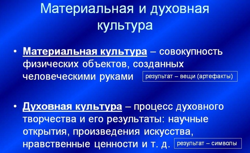 В это понятие входят те предметы, что были созданы искусственным путем для удовлетворения социальных и природных потребностей человека. Например, это может быть одежда или оружие, украшения или само жилище. Все это входит в понятие материальной культуры определенного народа. В широком смысле к этому относятся следующие элементы: