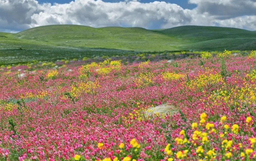 Весной степь прекрасна: травы образуют огромные, мягкие ковры, всё цветёт. Трудно поверить, что на самом деле здесь очень суровые погодные условия. Бывают сильные морозы и ветра. Летом нередко случается засуха.