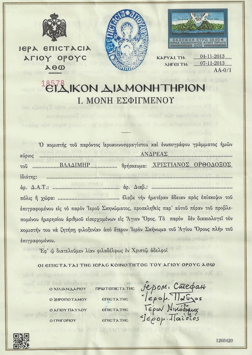 Отсылать данные надо только на английском или греческом языке. Если будете звонить, то сотрудник бюро хорошо разговаривает по-английски и поймет вас. Также вам надо указать, что вы православный человек и крещенный (обязательно скажите), иначе вам могут отказать в допуске. Пропуск начнет действовать только в день въезда, а в целом он действителен только 4 дня, если вы хоть на день позже приедете, то уже не сможете попасть на Афон. Стоит пропуск 50 евро. Когда вы прилетите и пойдете за пропуском, вам надо дополнительно показать паспорт и оплатить все, а только потом вам его выдадут. Ну и последнее, что хочу сказать относительно маршрута, вам надо лететь в международный аэропорт Салоников, а оттуда уже добираться до Афона.