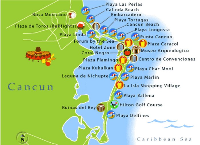 Дальше за "переломом" (см. схему) Отельной зоны море более "буйное". Это не означает, что там всегда очень сильные волны, вся пляжи Канкуна очень комфортные для отдыха.