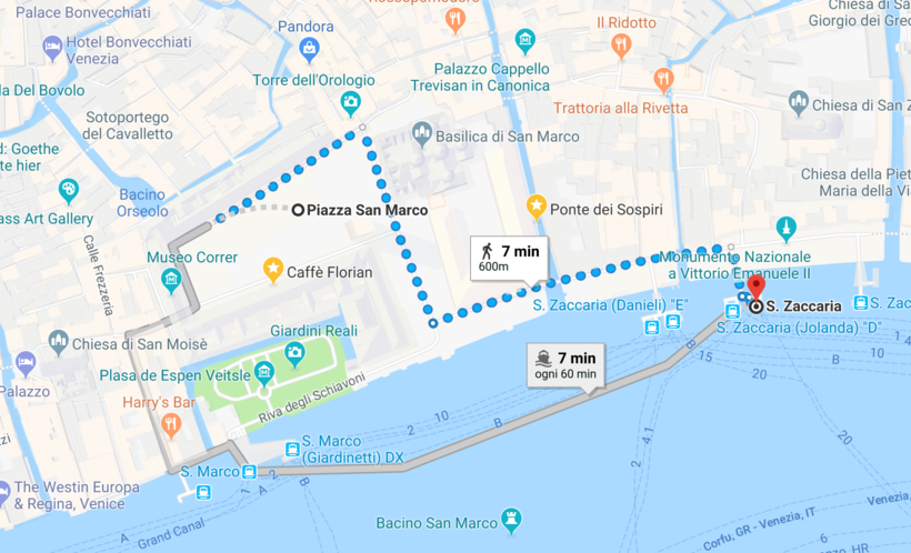 Здравствуйте, Эльвира. Ближайшая к площади Сан Марко остановка vaporetto называется S. Zaccaria (Jolanda) "C", на картинке пунктиром обозначено как можно дойти до остановки. Там можно сесть на vaporetto номер 4.2 или 5.2