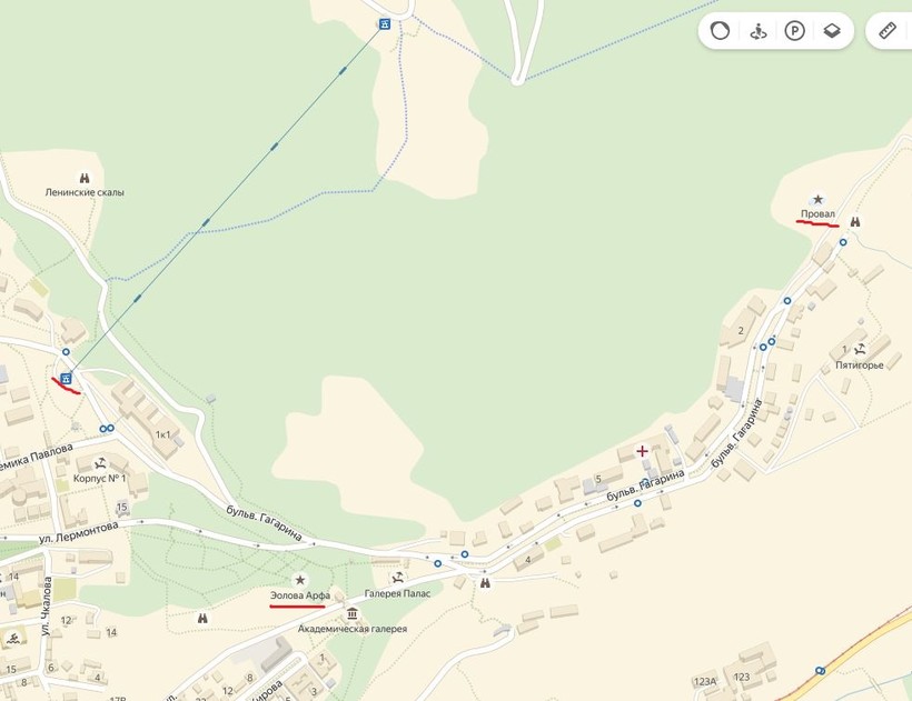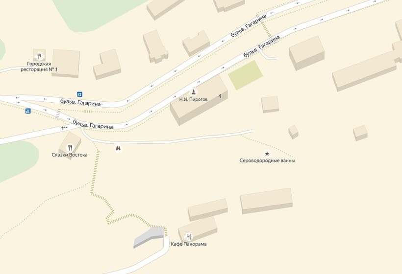 Далее по бульвару Гагарина мимо корпусов санатория "Родник" пройти к Эоловой арфе и посмотреть на парк "Цветник" сверху. За Пироговскими ваннами находятся "бесстыжие ванны", от Эоловой арфы удобнее всего спускаться через Эммануэлевский парк — один из старейших курортных парков, раскинувшийся на Михайловской горе. Оттуда до центра города совсем недалеко. Путь будет лежать мимо заброшенного дома Эльзы. очень жаль, что это здание пришло в упадок, это рана Пятигорска. Дорога приведет вас к еще одному источнику минеральной воды и санаторию "тарханы", переходим через дорогу и тут начинается советская часть парка: вечный огонь и огромный Ленин с отличным видом на город. Проходим дальше и спускаемся с лестницы в сквер у мерии города. В этом месте красиво вечером. Можно прогуляться через площадь у мерии через дорогу к Библиотеке и оттуда выйти на местный "бродвей" проспект Кирова и пройтись по нему если еще остануться силы. На следующий день можно запланировать маршрут на канатную дорогу(Подняться на вершину Машука)