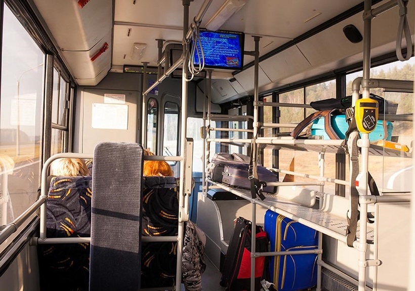 С правой стороны демонтированы все сиденья и установлены стеллажи для перевозки багажа. Также в салоне автобуса есть монитор, по которому транслируется различная реклама, и розетки для зарядки телефонов. В отличие от маршрутного такси здесь пассажирам доступ к Интернету не предоставляется.