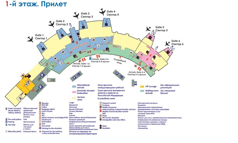 Зона прилета в аэропорт находится на первом этаже (всего этажей у терминала три). Вот схема первого этажа.