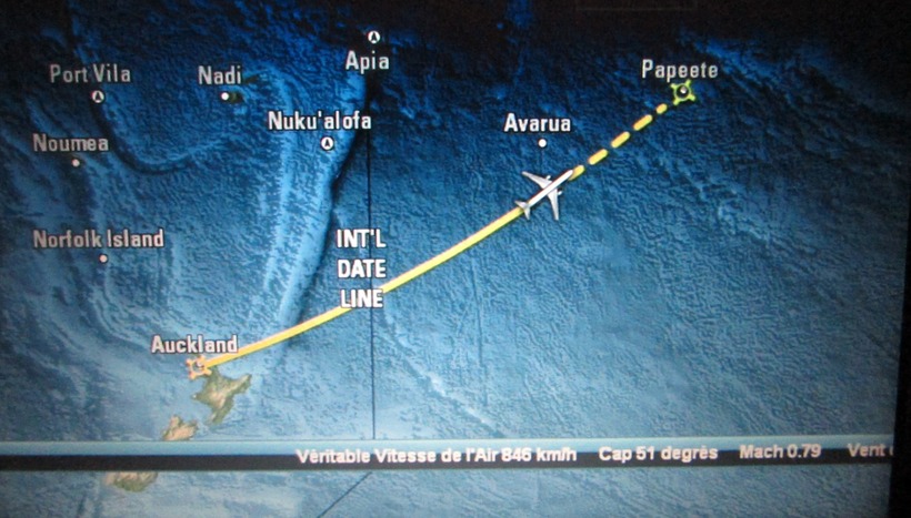 Это очень необычное чувство, когда пересекаешь по воздуху линию перемены дат и разглядываешь маршрут на экране монитора в самолете. Мы с другом вылетели из Новой Зеландии в 5 часов вечера, а прилетели на Таити за десять минут до полуночи, но, как оказалось, предыдущего дня. Получился своего рода «день сурка», когда мы прожили один и тот же день дважды. А на обратном пути мы вылетели в 9 утра и прилетели в Окленд в два часа, но уже следующего дня. Один день «потерялся», то есть его не было в нашем календаре. Даже не представляю, как с такой путаницей дат справляются бортпроводники, постоянно летающие по этому маршруту.