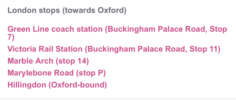 2. От Хитроу на метро или такси надо будет добраться до одной из остановок, откуда ходит автобус X90 Oxford London (ниже прилагаю фото с названием остановок для этого рейса). Стоимость билетов £8 в одну сторону или £14 с обратным билетом.