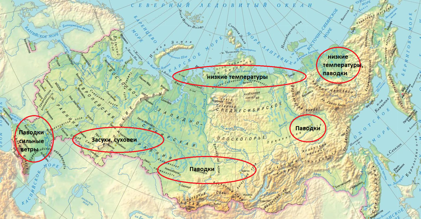 Такое явление, как заморозки, возможно на территории России повсеместно. Засуха — частая проблема степей и района полупустынь на Восточно-Европейской равнине. Причина засухи — влияние сухих воздушных масс пустынь Центральной Азии. Суховеи случаются в Прикаспийской низменности и на Северном Кавказе. Причина — приходящий из Восточной Азии сухой воздух. Паводки характерны территориям на берегах крупных рек (Лена, Ока, Селенга) — в районе Восточной Сибири и Дальнего Востока и у подножия гор — Южный ФО, районы у Алтайских гор. Причина — талые воды гор, а также обилие дождевых осадков на наветренных склонах гор. Низкие температуры свойственны территориям арктического и субарктического поясов (Дальний Восток, прибрежная полоса на севере Сибири). Сильные ветра особо распространены на приморских участках. Причина — усиливающийся антициклон. Обильные осадки возможны в умеренном поясе. Причина — прохождение холодных фронтов.