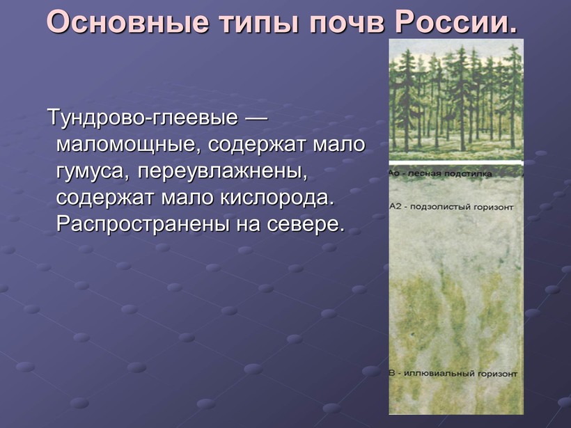Например: повышенная увлажнённость северной тайги способствовала образованию глеезёмов.