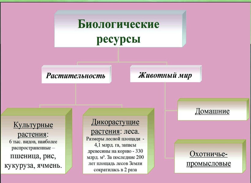 Значит, важнее всё-таки, другой вид природных ресурсов — тот, что связан с живой природой планеты. Он называется биологическими ресурсами и объединяет всё, что создано живыми организмами (биотой) и служит для людей источником материальных благ.