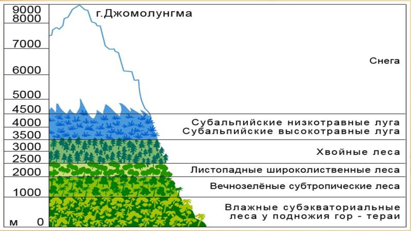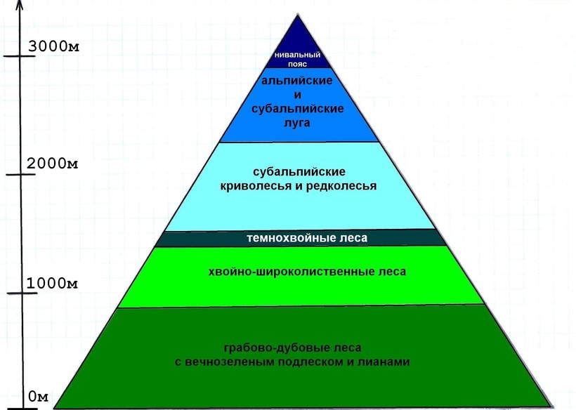 Высотная поясность — это смена природно-климатических зон с увеличением высоты над уровнем моря. Мне доводилось бывать в разных по высоте горах — от невысоких сопок, где с высотой ландшафт изменяется мало, до Гималаев, с тропиками у подножия и лютой зимой у вершин.
