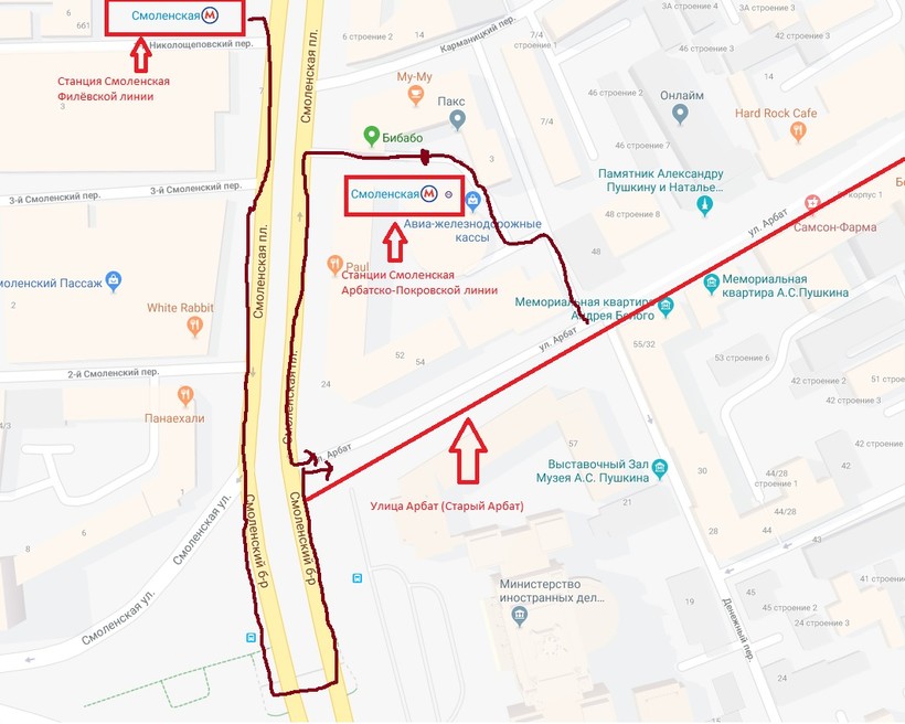 - Как идти до улицы Арбат от станции Смоленская Филёвской линии. Поднимаетесь из метро и выходите на Смоленскую площадь. Далее поворачиваете направо и идёте примерно 200 метров до наземного перехода, далее ещё немного до остановки и спускаетесь в подземный переход. После выхода из подземного перехода, идёте по ходу движения автомобилей до начала улицы Арбат.