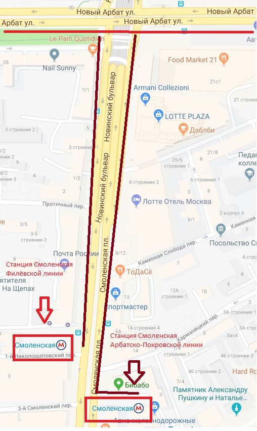 - Как идти до улицы Новый Арбат от станции Смоленская Филёвской линии. Поднимаетесь из метро и выходите на Смоленскую площадь. Далее поворачиваете налево и идёте до пересечения с улицей Новый Арбат (порядка 500 метров) и переходите по системе наземных пешеходных переходов на другую сторону Садового кольца и вы на Новом Арбате.