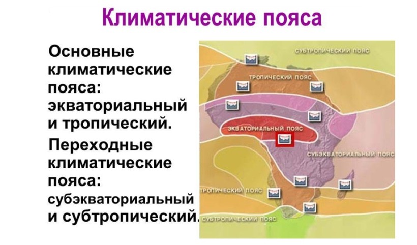 В первую очередь, это расположение большей части материка между тропиками, что определяет достаточно высокий показатель суммарной солнечной энергии. Поэтому на большей части материка преобладают высокие температуры, делая его самым жарким на планете. Поскольку материк пересекается экватором почти пополам, климатические зоны чередуются от него к югу и к северу. Нужно отметить, что погодные условия для каждого направления имеют свои особенности. Во многом это предопределяется тем фактом, что северная часть намного больше, чем южная, которая, помимо всего, еще и пролегает между Атлантическим и Индийским океанами. К основным климатообразующим факторам можно отнести: