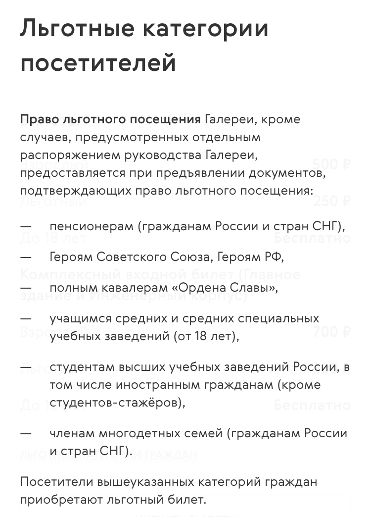 Какая цена билета в Третьяковскую галерею пенсионерам и детям?