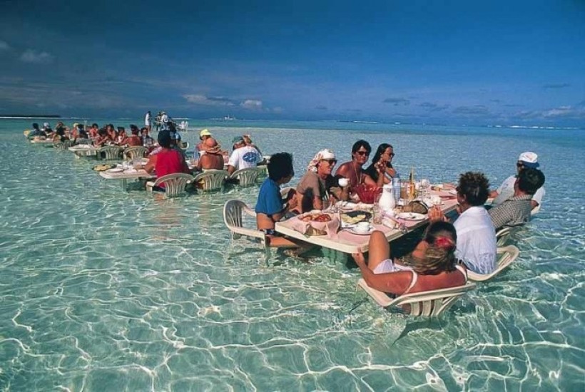 Так же, если не ошибаюсь, в аэропорту присутствует около 10 стоек от отелей Бора-Бора. Когда вы приедете, вы уже можете сразу определиться с отелем или подойти к стойке того отеля, где вы заранее забронировали номер. Вместо привычных ресторанов, здесь угощают обедом, который не совсем обычный. Туристам предлагают пообедать, но только в воде. Да-да, все так и есть, в воде стоят столики и стулья, вы туда можете зайти и сесть спокойно пообедать, наслаждаясь теплой водой.