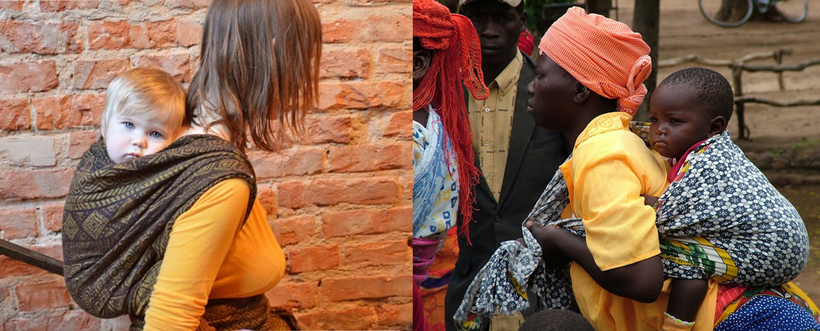 - В последнее время стало модно носить младенцев в слинге. Этот способ переноски младенцев мы подсмотрели как раз в африканских племенах.