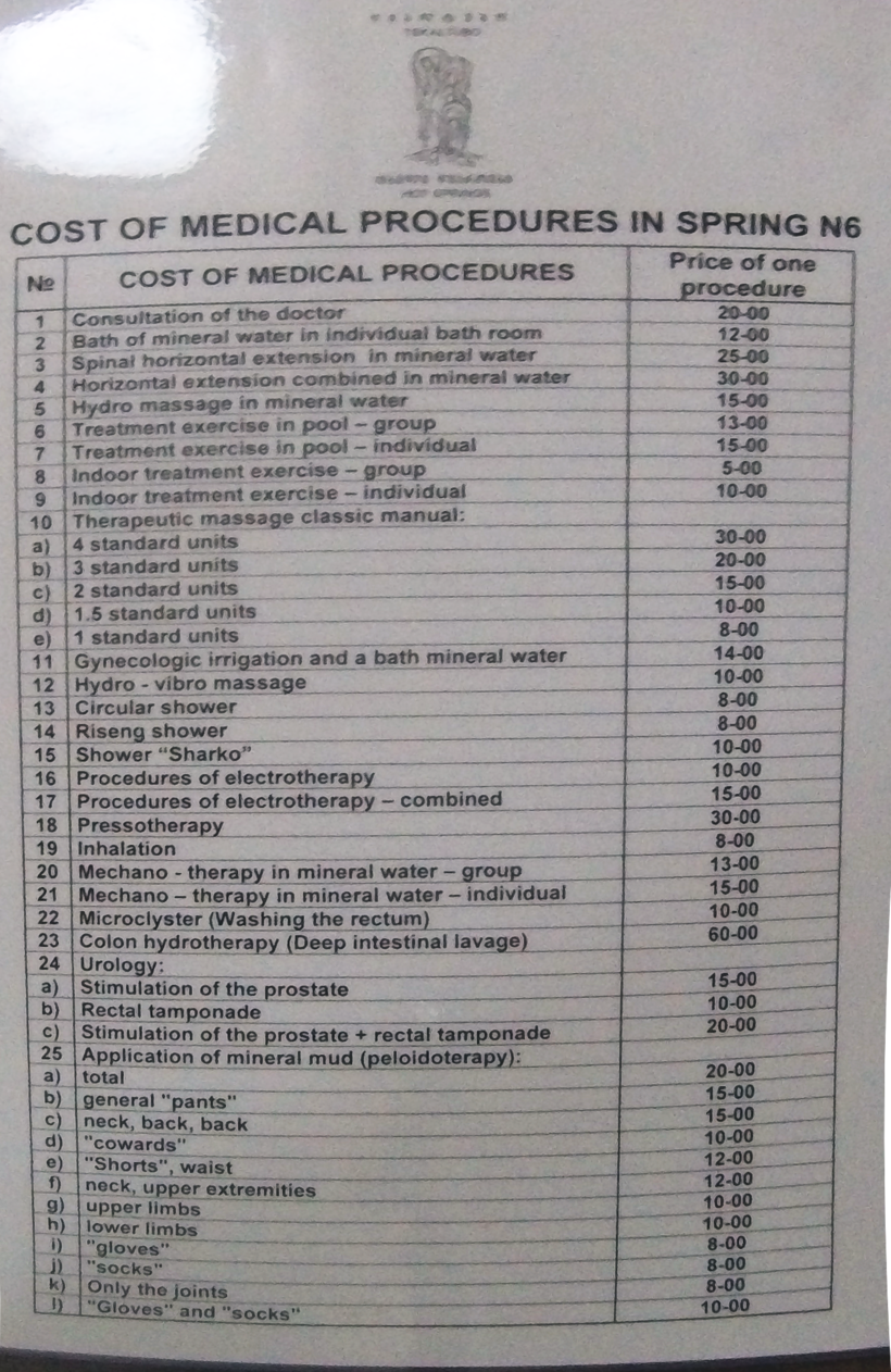 Цены в Цхалтубо очень демократичные, а качество услуг может сравниться с европейским уровнем, как в Карловых Варах, но конечно же с грузинской изюминкой! Например, массаж в ванной может сопровождаться грузинской песней) Цены на гидромассажные ванны 12 лари, на обычные меньше. В принципе, если взять 32 лари можно расслабиться по полной)