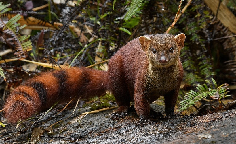 Кольцехвостый мунго, на мой взгляд, самый симпатичный зверёк. Учёные долгое время не могли определиться, к какому семейству отнести это животное. Сначала его определили в семейство виверровых, затем в семейство мангустовых. И, наконец, учёный мир решил всех хищников Мадагаскара объединить в одно семейство — малагасийских хищников. Мунго напоминает небольшого мангуста. Он отлично лазает по деревьям, охотясь за птицами. Умеет ловко разбивать скорлупу яиц о камни. Кроме того, он отлично плавает и ныряет, и даже ловит рыбу.