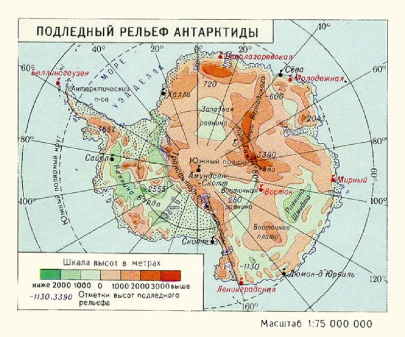 Более детально подлёдный рельеф у Антарктиды можно увидеть на рисунке.