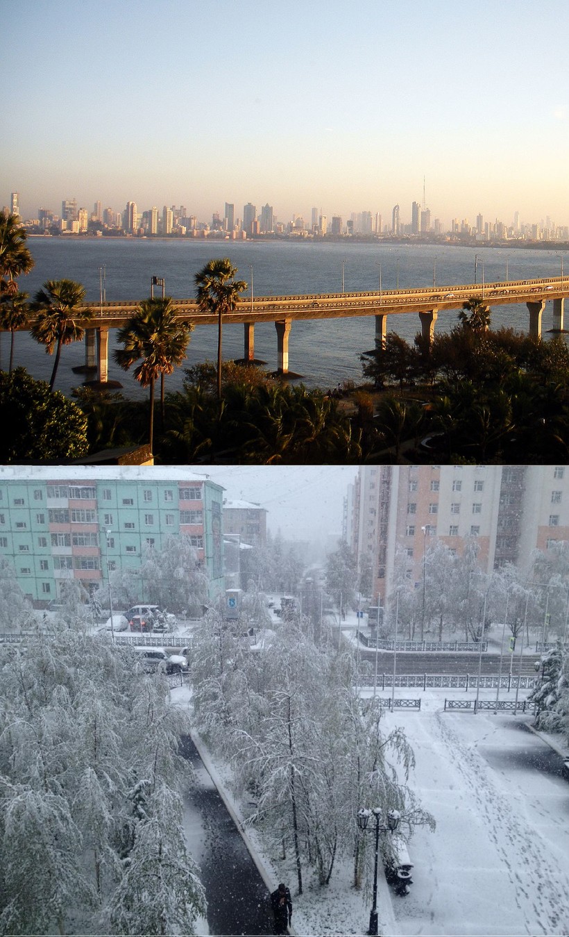 В основе отличий лежит разная степень прогрева участка, поскольку угол падения солнечных лучей возрастает по мере продвижения к полюсам, что означает меньшее количества тепла. Для яркости примера выберу города, расположенные практически на одинаковой долготе, но один лежит поближе к экватору, а другой — подальше от него: Мумбаи (Индия) и Надым (Ямало-Ненецкий автономный округ). В индийском городе средняя температура порядка 30 °C, а в целом показатель находится в пределах от 12 °C до 38 °C. В Надыме же средняя температура разительно ниже и равна −7,9 °C. Колеблется она от −25 °C до 19 °C. Если в Мумбаи календарная зима погодными условиями не выделяется, то в русском городе она отличается холодом и продолжительностью (около 8 месяцев). Согласитесь, что разница колоссальная.
